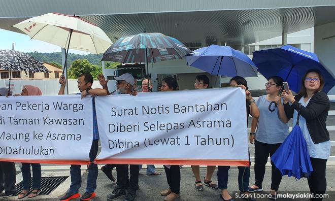 Penduduk membawa sepanduk berhimpun di hadapan tapak projek hari ini, menuntut kerajaan negeri dan Majlis Bandaraya Pulau Pinang (MBPP) menyelesaikan masalah yang akan timbul akibar pembinaan dua blok asrama tersebut.