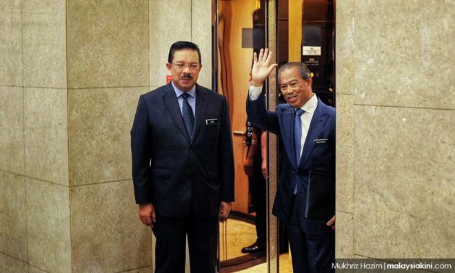 Muhyiddin disambut Ketua Setiausaha Negara Mohd Zuki Ali ketika tiba di Perdana Putra sebelum dibawa ke aras 5, yang menempatkan Pejabat Perdana Menteri.