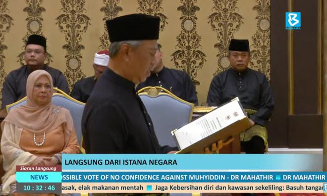 Presiden Bersatu Tan Sri Muhyiddin Yassin hari ini mengangkat sumpah jawatan sebagai Perdana Menteri kelapan di hadapan Yang di-Pertuan Agong Al-Sultan Abdullah Ri'ayatuddin Al-Mustafa Billah Shah.
