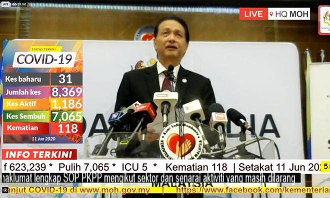 Ketua Pengarah Kesihatan Dr Noor Hisham Abdullah pada sidang media hariannya di Putrajaya, hari ini, berkata, dengan jumlah itu, kes positif Covid-19 di negara ini adalah sebanyak 8,369 kes.
