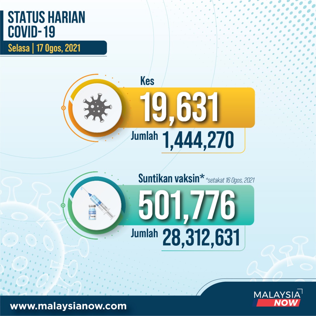19,631 kes baru direkodkan dengan Selangor kekal mencatat kes harian tertinggi sebanyak 5,753.