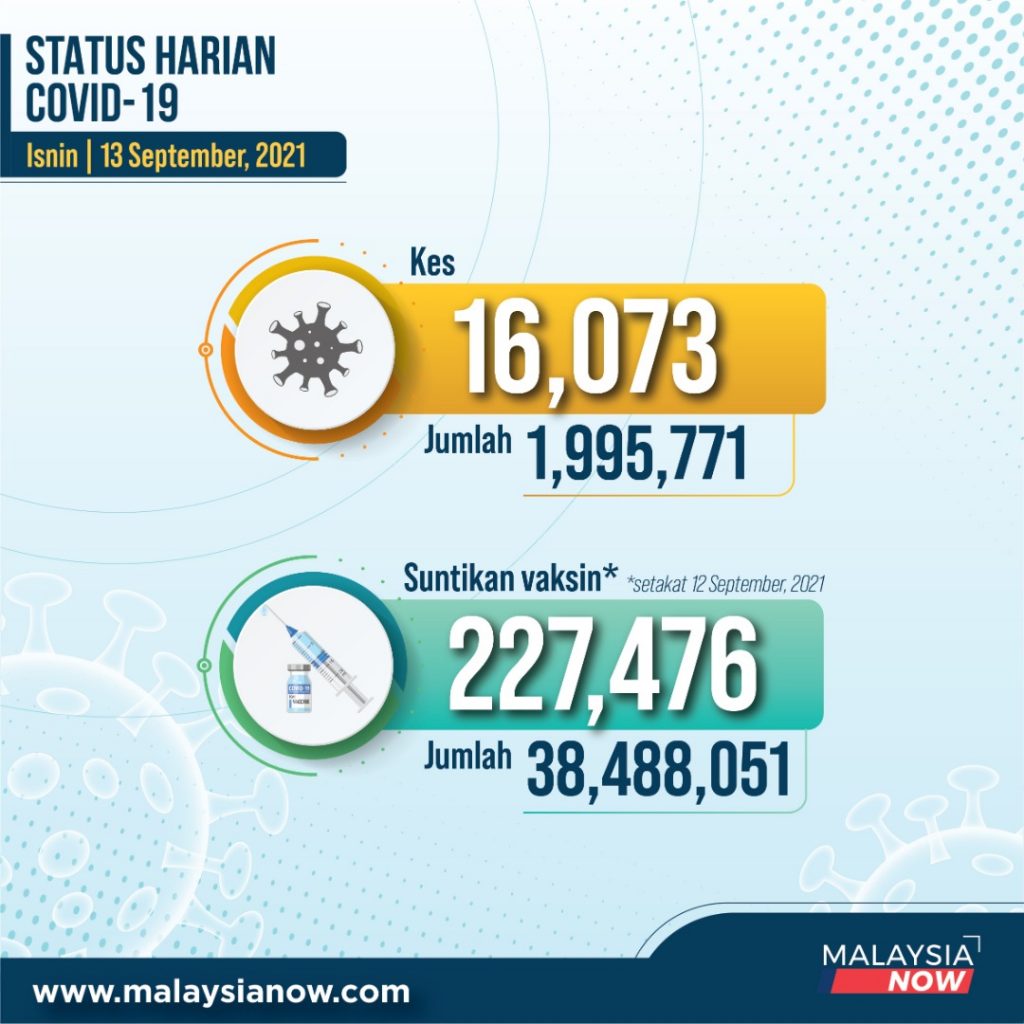 Malaysia merekodkan kes baru sebanyak 16,073 menjadikan kes keseluruhan Covid-19 meningkat sebanyak 1,995,771 kes.