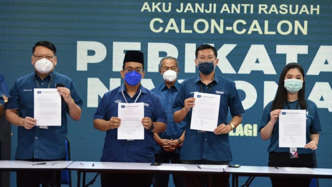 Kesemua calon berkenaan hadir di Bilik Gerakan Utama PN di Tanjung Minyak, di sini dan majlis menandatangani aku janji yang bermula pada pukul 9 malam itu, disaksikan Pengerusi PN Tan Sri Muhyiddin Yassin.