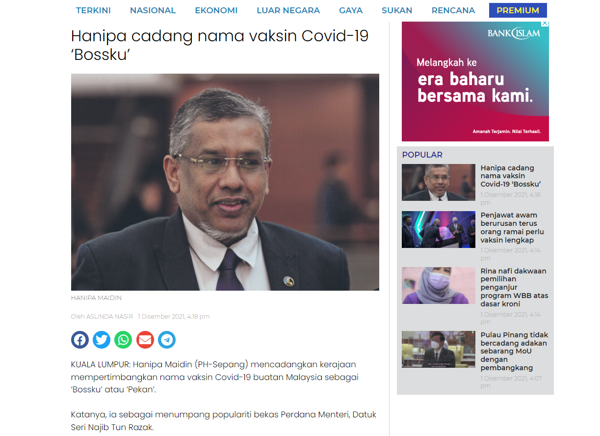 mempertimbangkan nama vaksin Covid-19 buatan Malaysia sebagai ‘Bossku’